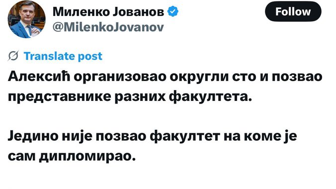 - Jedino nije pozvao fakultet na kome je sam diplomirao. Ne zna adresu - objavio je Jovanov na mreži X.