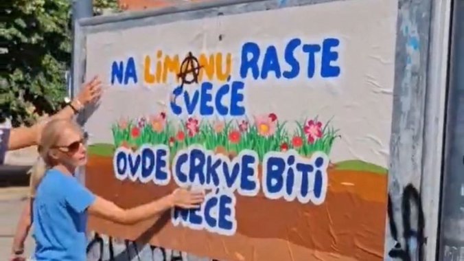 I to je za blokadere poruka mržnje (?!) koju su oni rešili da prelepe posterom na kom stoji: "Na Limanu raste cveće, ovde crkve biti neće".