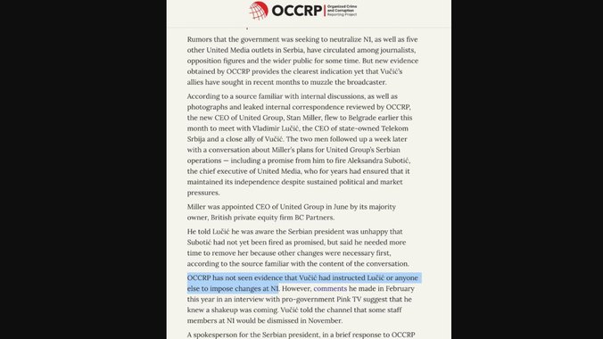 ''OCCRP nije evidentirao da je Vučić davao instrukcije Lučiću niti bilo kome drugom da sprovodi promene na N1'', piše u ovom Izveštaju.
