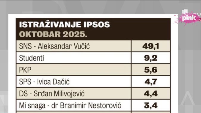 Prema najnovijem omnibus istraživanju za oktobar mesec prestižne agencije Ipsos da se parlamentarni izbori u Srbiji održavaju u nedelju 2. novembra, lista Srpske napredne stranke Aleksandra Vučića osvojila bi 49,1 odsto glasova, dok bi tzv. "studentska lista" dobila 9,2 procenata podrške građana.