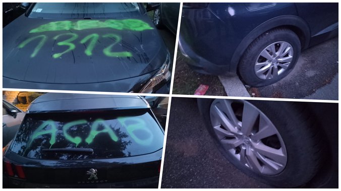 Privatni automobil bračnog para, pripadnika Jedinice za obezbeđenje određenih ličnosti i objekata (JZO) MUP- Srbije, koji je bio parkiran u ulici Velizara Stankovica, ispred zgrade u kojoj žive je tokom noci isaran sprejom, isečene su gume.