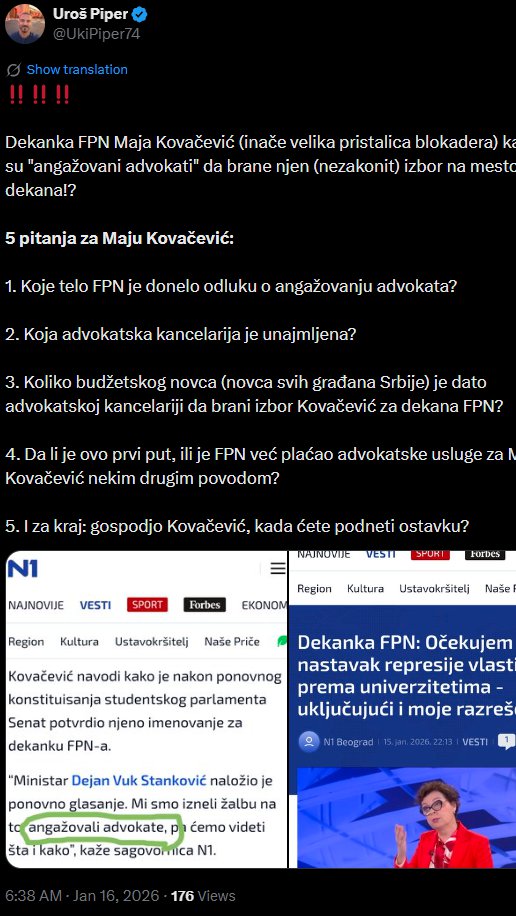 "Dekanka FPN Maja Kovačević (inače velika pristalica blokadera) kaže da su "angažovani advokati" da brane njen (nezakonit) izbor na mesto dekana!?