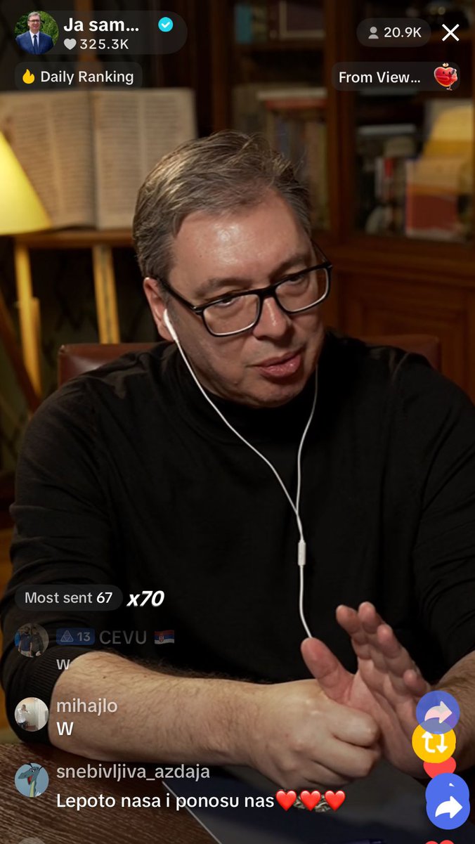 Vučić je na TikToku gledalo ukupno 241.700 ljudi, dok je lajv skupio 13 miliona "lajkova".