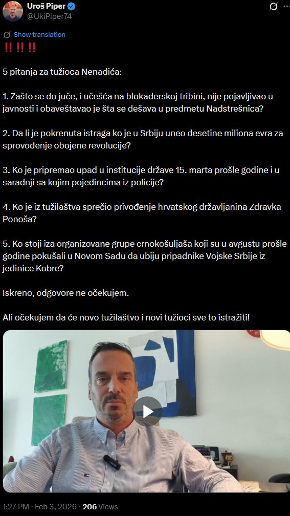 - Sve su to pitanja za tužioca Nenadića na koja verovatno nećemo dobiti odgovore, ali, nadam se i iskreno verujem da dolazi vreme promena, dolazi vreme odgovornosti i neko novo tužilaštvo, neki novi tužioci, verovatno, će nam dati odgovore na sva ta pitanja - zaključuje Piper.