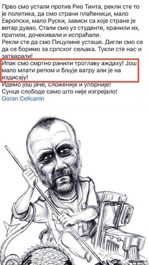 Samo dan ranije samoproglašena ekološka aktivistkinja i blokaderka Ljiljana Bralović, koja je sredinom februara u Čačku poručila da se "spremi katran i perje" jer će predstavnike vlasti "juriti po ulicama, šutirati ih i svašta im raditi“, sada je objavila jezivu fotografiju na kojoj lažni ekolog Zlatko Kokanović kopljem probada predsednika Srbije.