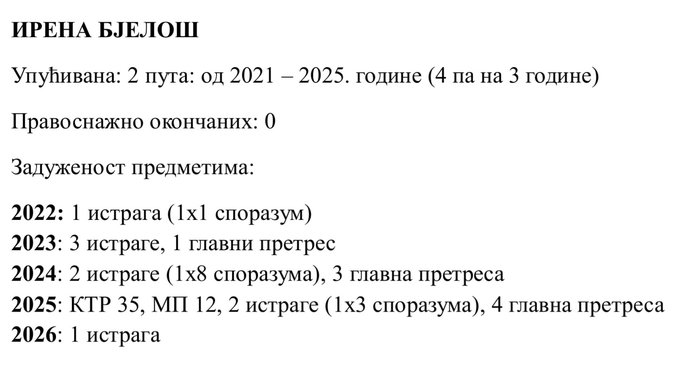Tužiteljka Irena Bjeloš, kako saznajemo, ima svega nekoliko istraga i suđenja i nijednu pravosnažnu presudu, a već pet godina je upućena u JTOK na duplo veću platu od koje primaju njene kolege u Višem javnom tužilaštvu u Beogradu u koje će se vratiti sledećeg utorka.