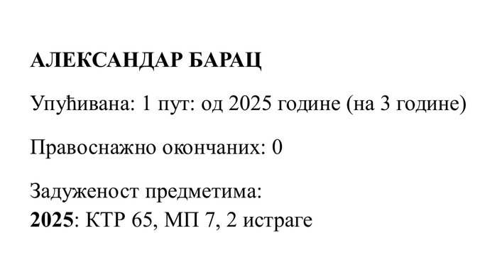 Tužilac Aleksandar Barac koji je upućen u JTOK prošle godine iz VJT u Novom Sadu ima u radu samo dve istrage, od kojih se jedna tiče sumnji o nepravilnostima u vezi sa finansiranjem rekostrukcije pruge Novi Sad - Subotica.