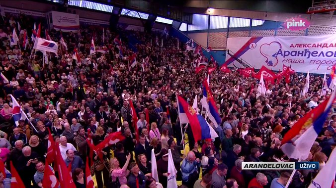 Predsednik Srbije Aleksandar Vučić obratio se građanima u Aranđelovcu na mitingu SNS. Sportska hala bila je popunjena do poslednjeg mesta, a predsednik je dočekan velikim ovacijama i aplauzom.