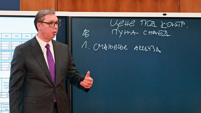 - Da bi ostvarili to, naše mere su sledeće: Pod jedan, smanjenje akciza, i to ću morati da objasnim. Objasniću kako to izgleda na današnjoj ceni, ali hoću da vam pokažem kako ćemo to da radimo. Da vidite šta će država da uradi, i to može da uradi samo onaj ko ima značajne finansijske bafere. Mi to imamo, ali reći ću i gde su problemi. Kada pogledate akcizu, koju smanjite za 20 odsto, mi gubimo u prihodima 4,1 milijardu, što je 35 miliona evra! Da držimo samo na 20 odsto, na godišnjem nivou to vam je 420 miliona evra - rekao je Vučić i dodao: