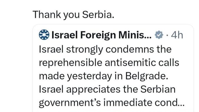 Israel appreciates the Serbian government’s immediate condemnation of these calls and its firm and consistent stance in the fight against antisemitism. pic.twitter.com/O8iGrwYB85