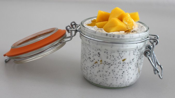 Pomešajte sve sastojke u tegli ili posudi. Dobro promešajte, a zatim ponovo promešajte nakon desetak minuta da biste sprečili zgrudvavanje. Poklopite i ostavite u frižideru najmanje 2-3 sata, a najbolje preko noći. Pre konzumiranja promešajte i servirajte samostalno ili sa dodacima.