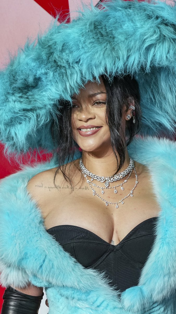 Nosila je asimetričnu haljinu od svetloplavog umetničkog krzna sa crnim korsetom, koju je upotpunila kožnim rukavicama do lakta i velikim svetloplavim krznenim šeširom. Uz Rijanu je bio njen partner, muzičar ASAP Roki, koji je nosio tamnoplavo oversize odelo sa belom košuljom i crvenom kravatom.