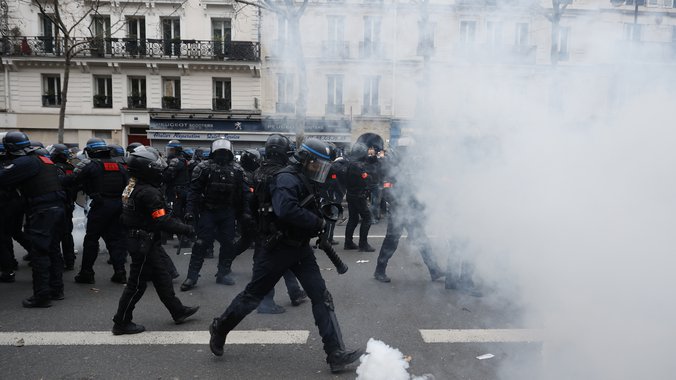 Dok je Makron govorio u Španiji, policija je u Parizu intervenisala protiv nekih demonstranata koji su bacali predmete na pretežno mirnom protestu.