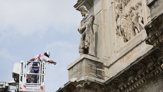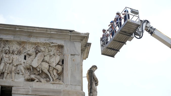 Grom, koji je pogodio antički Konstantinov slavoluk u blizini Koloseuma u Rimu tokom oluje u utorak, oštetio je delove te antičke građevine, saopštio je danas Arheološki park Koloseum.