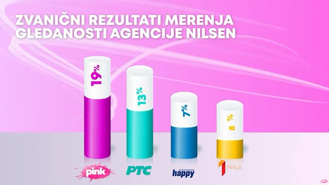 Televizija Pink je od svih komercijalnih emitera ali i Javnog servisa Srbije bila gledanija u totalu, među ženskom publikom, među gledaocima starosti od 18 do 49 godina, među ženskom publikom starosti od 18 do 49 godina, među među gledaocima sa teritorije Beograda i među urbanom populacijom, dok je od svih komercijalnih televizija bila gledanija među gledaocima iz prestonice starosti od 18 do 49 godina.