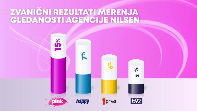 Televizija Pink je od svih komercijalnih emitera bila gledanija u totalu, među gledaocima starosti od 18 do 49 godina, među ženskom publikom starosti od 18 do 49 godina, među gledaocima sa teritorije Beograda, među gledaocima iz prestonice starosti od 18 do 49 godina i među urbanom populacijom, dok je i od Javnog servisa Srbije bila gledanija među ženskom publikom.