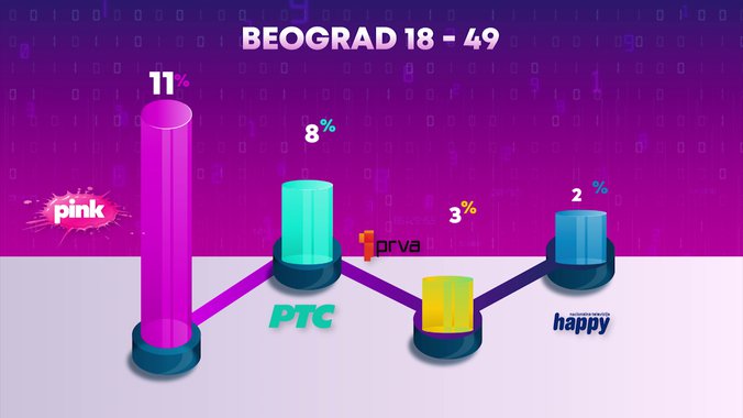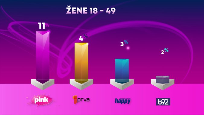 Televizija Pink je od svih komercijalnih emitera, ali i Javnog servisa Srbije bila gledanija u totalu, među ženskom publikom, među gledaocima sa teritorije Beograda i među gledaocima iz prestonice starosti od 18 do 49 godina, dok je od svih komercijalnih emitera bila gledanija među gledaocima starosti od 18 do 49 godina, među ženskom publikom starosti od 18 do 49 godina, kao i među urbanom populacijom.