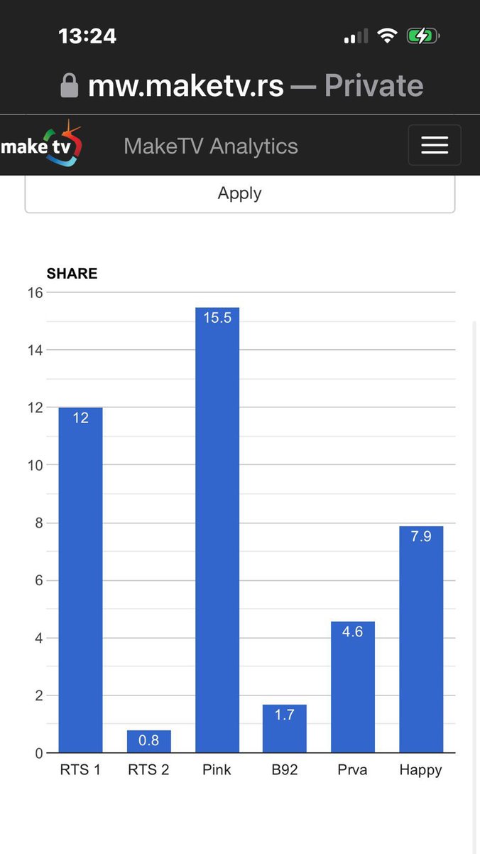 Zvanična istraživanja gledanosti pokazuju da je najveći broj gledalaca trenutno uz Televiziju Pink i prati informativni program naše televizije.