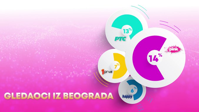 Televizija Pink je od svih komercijalnih emitera, ali i Javnog servisa Srbije bila gledanija u totalu.... među ženskom publikom..... među ženskom publikom starosti od 18 do 49 godina.... među gledaocima sa teritorije Beograda..... i među urbanom populacijom, dok je od svih komercijalnih televizija bila gledanija među gledaocima starosti od 18 do 49 godina.... kao i među gledaocima iz prestonice starosti od 18 do 49 godina.