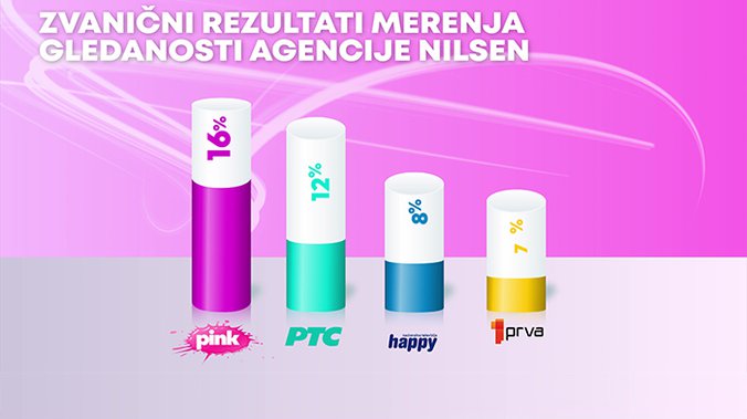 Televizija Pink je od svih komercijalnih emitera, ali i Javnog servisa Srbije bila gledanija u totalu, među ženskom publikom, među gledaocima starosti od 18 do 49 godina, među ženskom publikom starosti od 18 do 49 godina, među gledaocima sa teritorije Beograda, među gledaocima iz prestonice starosti od 18 do 49 godina i među urbanom populacijom.