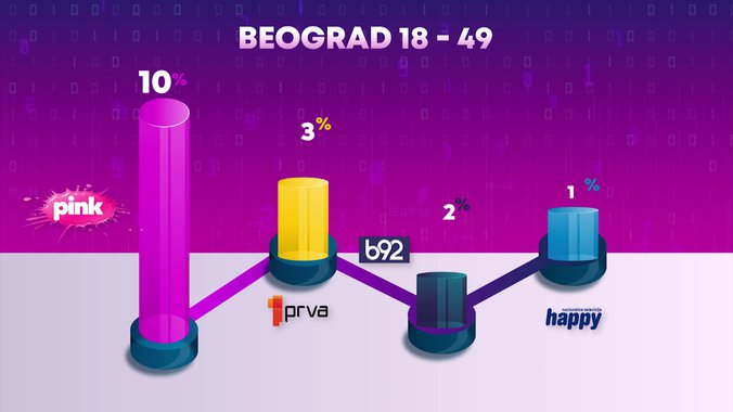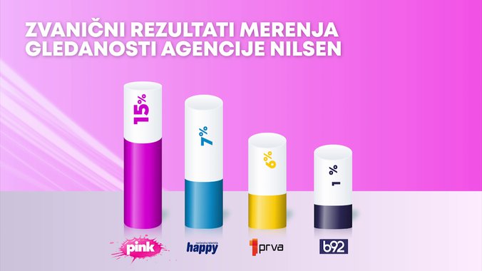 Televizija Pink je od svih komercijalnih emitera bila gledanija u totalu..... među gledaocima starosti od 18 do 49 godina.... među ženskom publikom starosti od 18 do 49 godina..... među gledaocima sa teritorije Beograda..... među gledaocima iz prestonice starosti od 18 do 49 godina.... i među urbanom populacijom, dok je i od Javnog servisa Srbije bila gledanija među ženskom publikom.