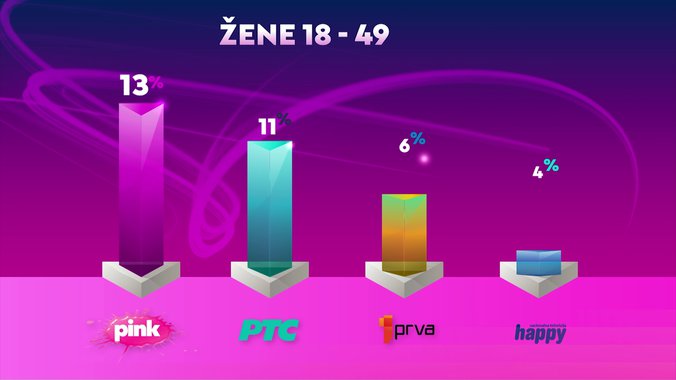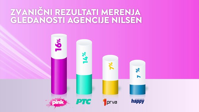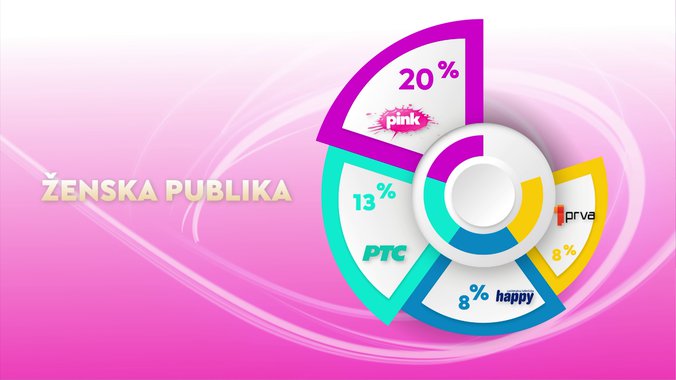 Televizija Pink je od svih komercijalnih emitera, ali i Javnog servisa Srbije bila gledanija u totalu, među ženskom publikom, među ženskom publikom starosti od 18 do 49 godina, među gledaocima sa teritorije Beograda i među gledaocima iz prestonice starosti od 18 do 49 godina, dok je od svih komercijalnih televizija bila gledanija među gledaocima starosti od 18 do 49 godina, kao i među urbanom populacijom.