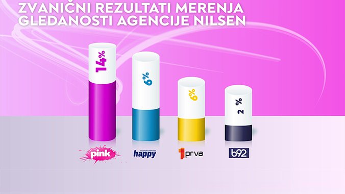 Televizija Pink je od svih komercijalnih emitera bila gledanija u totalu, među gledaocima starosti od 18 do 49 godina, među ženskom publikom starosti od 18 do 49 godina, među gledaocima sa teritorije Beograda, među gledaocima iz prestonice starosti od 18 do 49 godina i među urbanom populacijom, dok je i od Javnog servisa Srbije bila gledanija među ženskom publikom.