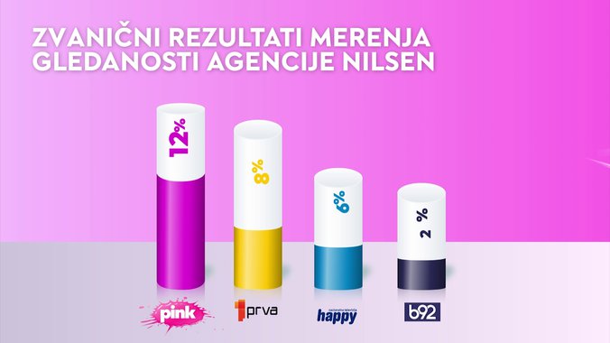 Televizija Pink je od svih komercijalnih emitera bila gledanija u totalu, među ženskom publikom, među gledaocima starosti od 18 do 49 godina, među ženskom publikom starosti od 18 do 49 godina, među gledaocima sa teritorije Beograda, među gledaocima iz prestonice starosti od 18 do 49 godina, kao i među urbanom populacijom.