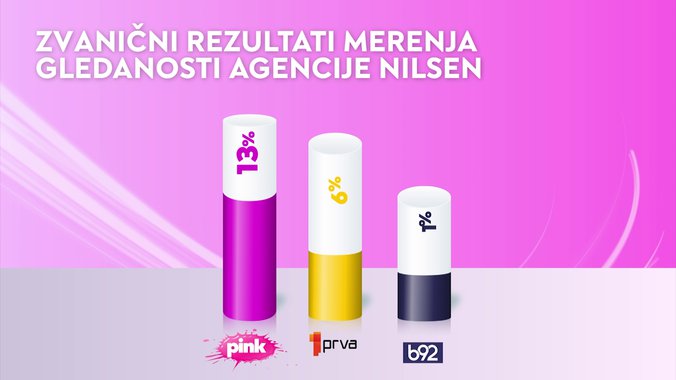 Televizija Pink je od svih komercijalnih emitera bila gledanija u totalu, među gledaocima starosti od 18 do 49 godina, među gledaocima sa teritorije Beograda, među gledaocima iz prestonice starosti od 18 do 49 godina i među urbanom populacijom, dok je i od Javnog servisa Srbije bila gledanija među ženskom publikom, kao i među ženskom publikom starosti od 18 do 49 godina.