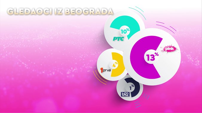 Televizija Pink je od svih komercijalnih emitera, ali i Javnog servisa Srbije bila gledanija u totalu, među ženskom publikom, među gledaocima sa teritorije Beograda, među gledaocima iz prestonice starosti od 18 do 49 godina i među urbanom populacijom, dok je od svih komercijalnih televizija bila gledanija među gledaocima starosti od 18 do 49 godina, kao i među ženskom publikom starosti od 18 do 49 godina.