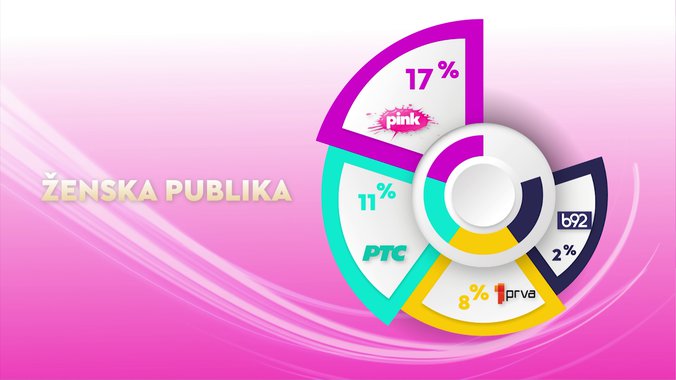 Televizija Pink je od svih komercijalnih emitera, ali i Javnog servisa Srbije bila gledanija u totalu, među ženskom publikom, među ženskom publikom starosti od 18 do 49 godina, među gledaocima iz prestonice starosti od 18 do 49 godina i među urbanom populacijom, dok je od svih komercijalnih televizija bila gledanija među gledaocima starosti od 18 do 49 godina... kao i među gledaocima sa teritorije Beograda.