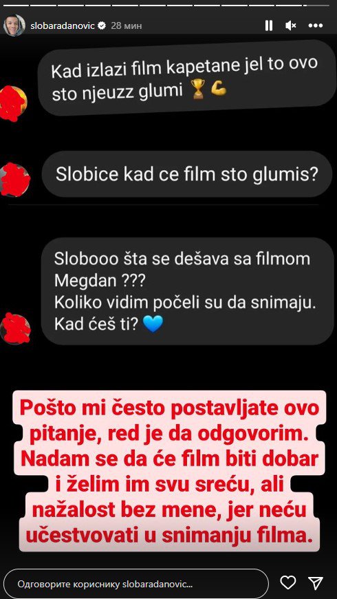 Pošto mi često postavljate ovo pitanje, red je da odgovorim. Nadam se da će film biti dobar i želim im svu sreću, ali nažalos bez mene, jer neću učestvovati u tom filmu, napisao je Sloba.