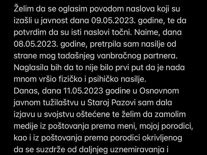08.05.2023. godine, pretrpela sam nasilje od strane mog tadašnjeg vanbračnog partnera. Naglasila bih da to nije bio prvi put da je nada mom vršio fizičko i psihicko nasilie. Danas, dana 11.05.2023 godine u Osnovnom javnom tužilaštvu u Staroj Pazovi sam dala iziavu u svojstvu oštećene te želim da zamolim medije iz poštovanja prema meni, mojo porodici, kao i iz poštovanja prema porodici okrivljenog da se suzdrže od daljeg uznemiravanja i iznošenja detalja - napisala je ona, pa dodala: