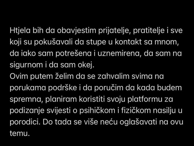 Htela bih da obavestim prijatelje, pratioce i sve koji su pokušavali da stupe u kontakt sa mom, da iako sam potrešena i uznemirena, da sam na sigurnom i da sam okej. Ovim putem želim da se zahvalim svima na porukama podrške i da poručim da kada budem spremna, planiram koristiti svoju platformu za podizanie svesti o psihičkom i fizičkom nasilju u porodici. Do tada se više neću oglašavati na ovu temu.