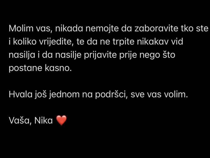 Molim vas, nikada nemojte da zaboravite ko ste i koliko vredite, te da ne trpite nikakav vid nasilia i da nasilie prijavite pre nego što postane kasno. Hvala jos jednom na podrsci, sve vas volim. Vaša, Nika - napisala je influenserka na svom Instagram profilu.