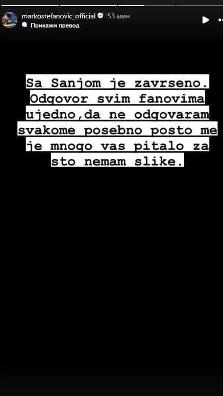 Bivši učesnici rijalitija "Zadruga" Sanja Grujić i Marko Stefanović raskinuli su, a čini se da je njihov razlaz bio buran, pa je tako Marko na društvenoj mreži Instagram, pratiocima poručio da ga ne pitaju za devojku.