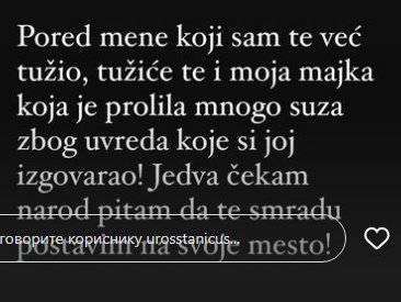 - Pored mene koji sam te već tužio, tužiće te i moja mnajka koja je prolila mnogo suza zbog zvreda koje si joj izgovarao! Jedva čekam da te postavim na svoje mesto smradu - napisao je Uroš.
