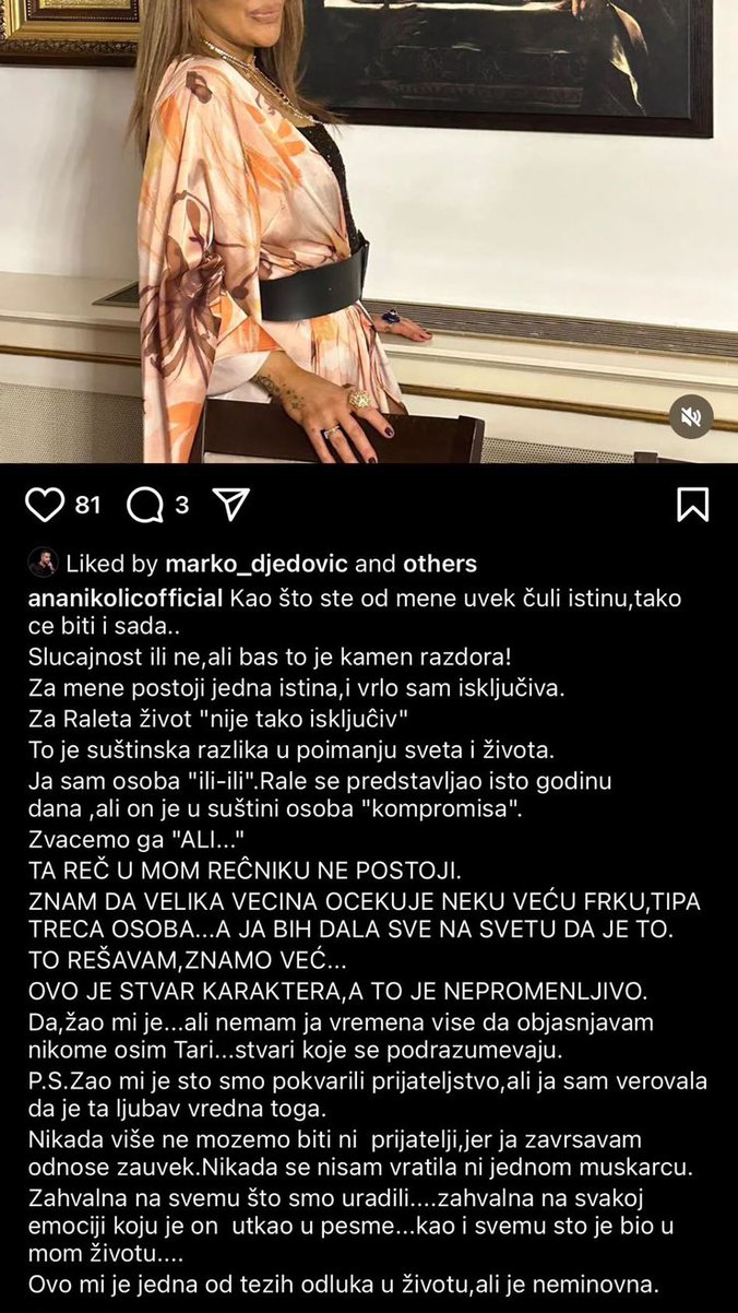 Pevačica Ana Nikolić otkrila je svojim pratiocima na Instagramu da je stavila tačku na vezu sa Goranom Ratkovićem Raletom i da njih dvoje više nikada ne mogu da budu ni prijatelji.