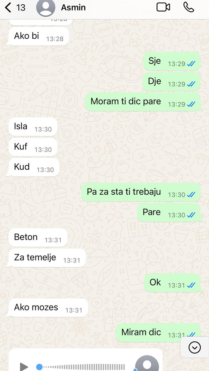 Asmin u porukama piše Aneli da mu novac treba za beton, pa je moli da mu da pare, i govori joj da će joj vratiti za par dana.
