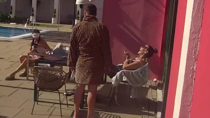 Milena Kačavenda sunčala se ispred paba "Prijatelji" i razgovarala sa Nenadom Marinkovićem Gastozom. U jednom trenutku njoj se pomerila marama, pa su joj sevnule grudi, a Gastoz ju je odmah upozorio da se pokrije, zbog čega je ona počela da se smeje kao luda.