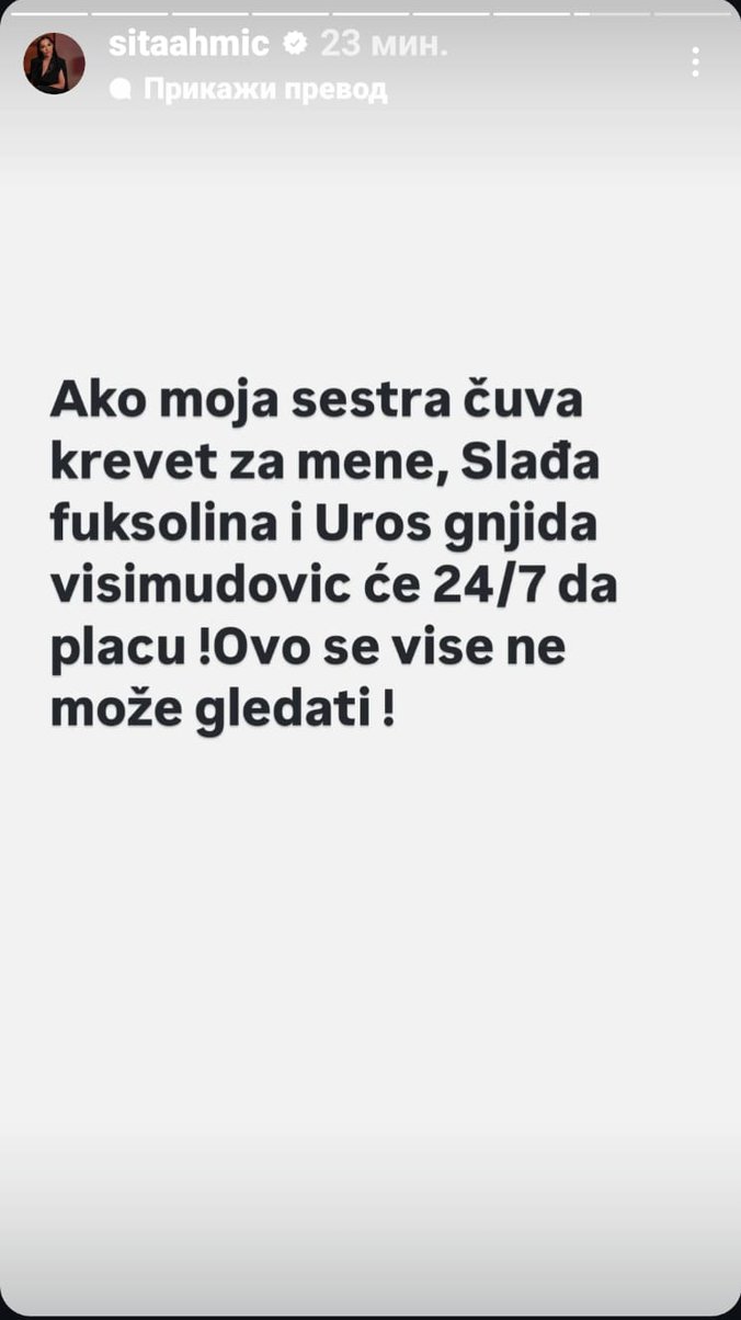 - Ako moja sestra čuva krevet za mene, Slađa fu*solina i Uroš gnjida visimudović će 24/7 da plaču! Ovo se više ne može gledati - bila je jasna Sita.