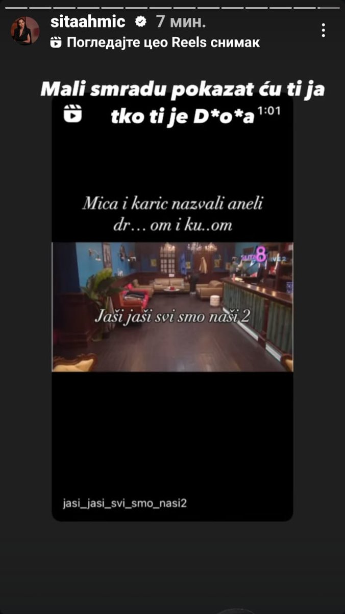 - Mali smradu pokazaću ti ja ko ti je dr*lja - napisala je Sita uz snimak na kom Mića i Stefan Karić vređaju Aneli.