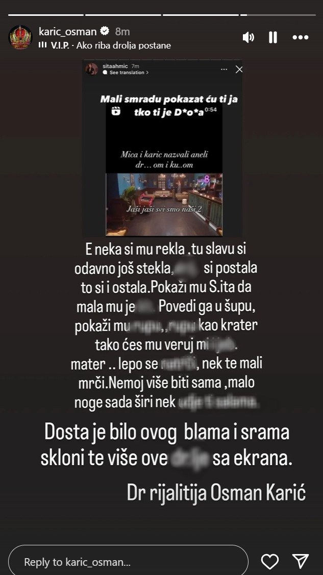 Sada je posle ovog Sitinog oglašavanja usledila i Osmanova reakcija, te je uputio Siti niz brutalnih uvreda putem instagram storija.