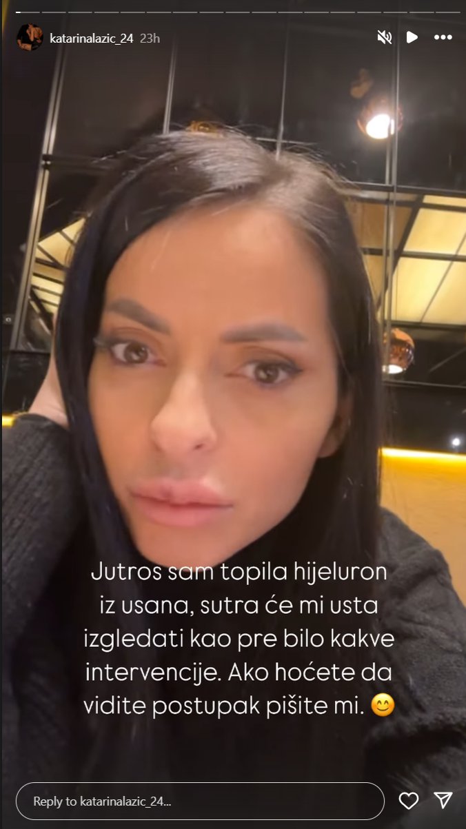 - Jutros sam topila hijaluron iz usana, sutra će mi usta izgledati kao pre bilo kakve intervencije - našpisala je ona, a potom strpljivo odgovarala na pitanja pratilaca u vezi sa procedurom, rezultatima i drugim stvarima.