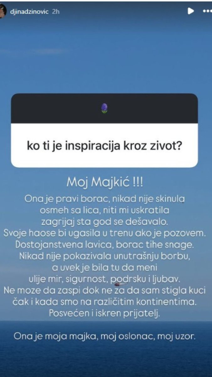 - Moj majkić. Ona je pravi borac, nikad nije skinula osmeh sa lica, niti mi uskratila zagrljaj, šta god da se dešavalo. Svoje haose bi ugasila u trenu ako je pozovem. Dostojanstvena lavica, borac tihe snage. Nikad nije pokazivala unutrašnju borbu, a uvek je bila tu da meni ulije mir, sigurnost, podršku i ljubav. Ne može da zaspi dok ne zna da sam stigla kući čak i kada smo na različitim kontinentima. Posvećen i iskren prijatelj. Ona je moja majka, moj oslonac, moj uzor - napisala je Đina, pa zasigurno i izmamila razne reakcije drugih fanova.