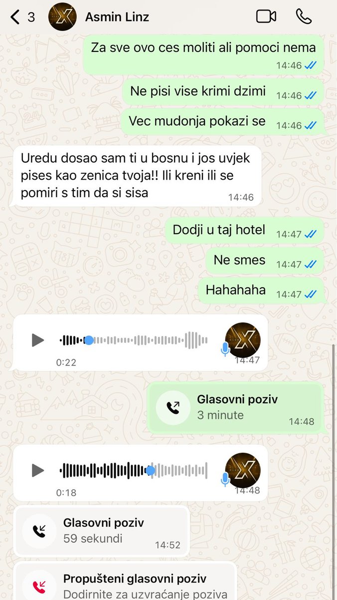 - Druže, j*bem ti mater u p*čku. Šta ja da se čekiram i čekam u hotlelu? Neću sa tobom da se nalazim u hotelu nego napolju. Nisam ja p*der da te g*zim u hotelu. Šta glumiš ti i igraš igre p*derske? Ili kreni ili odj*bi iz mog telefona, j*bem ti Biljanu u usta... Šalješ mi poruke iz Beograda da se čekiram. Evo tu sam i pošalji mi lokaciju da si na putu, a ja ću da te dočekam na putu. Mani me dečijih igara, dovoljno si me već iznervirao, ti i niko drugi svojim glupostima - glasila je glasovna poruka koju je Alibaba poslao Luki.
