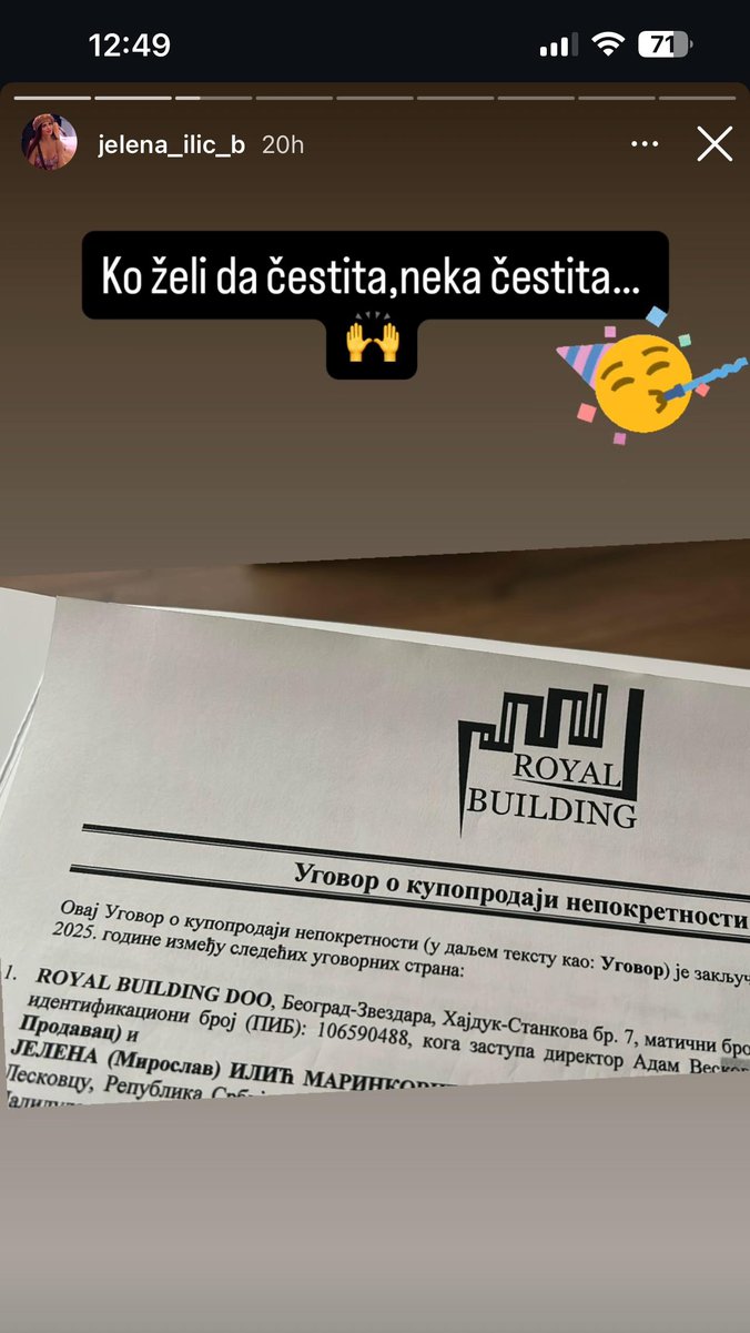 Jelena je dugo bila podstanar u Beogradu, a sada konačno ima svoj "krov nad glavom". Sada, kada se stambeno obezbedila, pohvalila se na društvenim mrežama kupoprodajnim ugovorom.