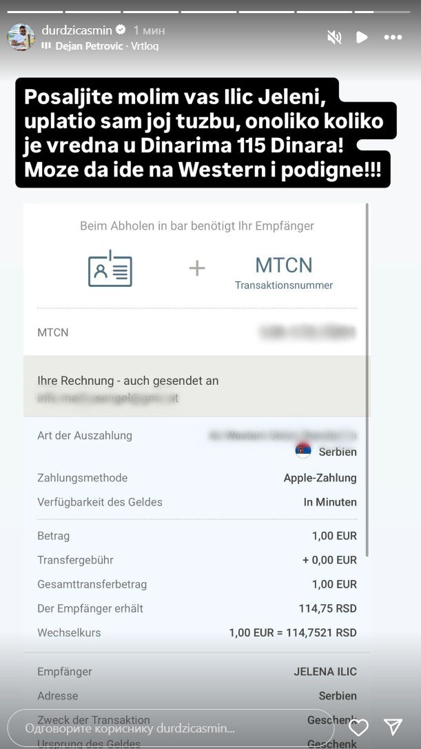 - Pošaljite molim vas Ilić Jeleni, uplatio sam joj tužbu, onoliko koliko je vredna u dinarima 115 dinara! Može da ide na Western i podigne -napisao je Asmin, a ispod priložio dokaz o uplati.