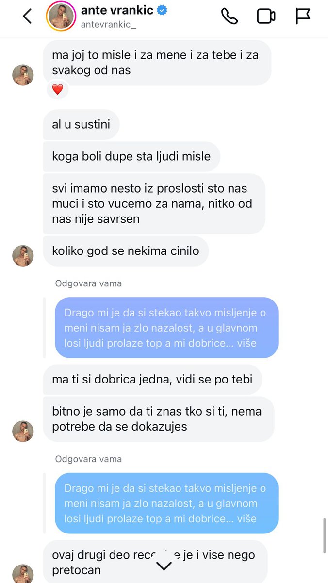 Mi smo odmah pozvali Uroša kako bi proverili da li je ovo istina, što je on oštro demantovao, te nam je tako dostavio prepiske sa Anteom u kojima se vidi, a i čuje, kako Ante govori da se pričalo da je zbog Uroševe slike s dečkom, zapravo Uroš s Antonijom, te i da to nije istina.