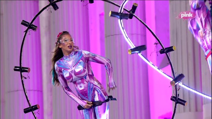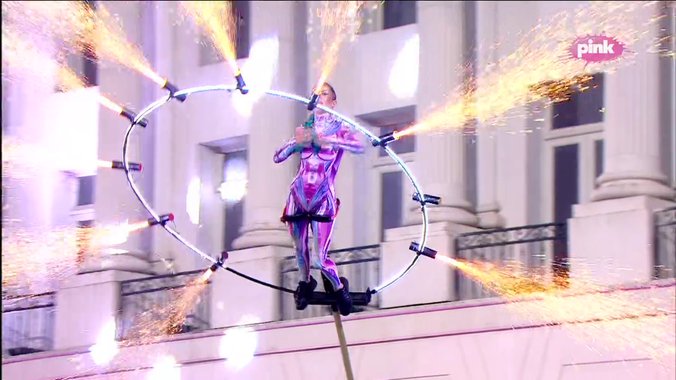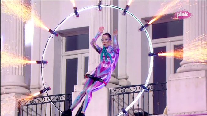 Voditeljka Dušica Jakovljević najavila je plesnu tačku kojom su svi bili intrigirani. Naime, devojka sa ispletenom kikom u plavo-ljubičastoj boji u krugu u kojem se sve vreme vrti, a oko kojeg sve vreme gori poput mini vatrometa.